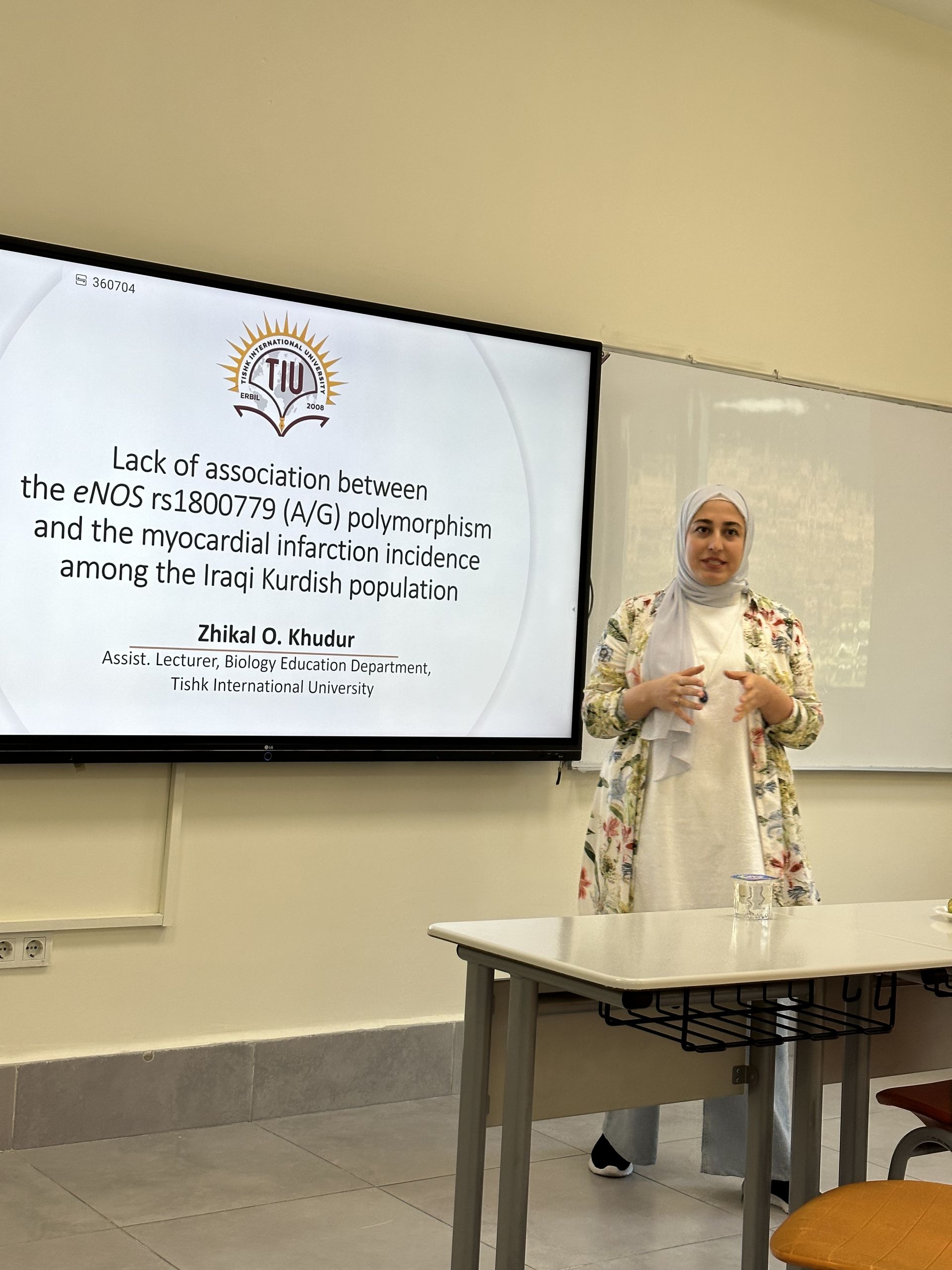 On September 11th 2023, Ms. Zhikal O Khudhur, Assistant Lecture in the Department of Biology Education, Faculty of Education at Tishk International University (TIU) presented a topic of great interest and importance – the possible association between the eNOS rs1800779 (A/G) polymorphism and the incidence of myocardial infarction (MI) among the Iraqi Kurdish population. The implications of such research are substantial, as understanding genetic factors contributing to heart disease can help improve prevention and treatment strategies.