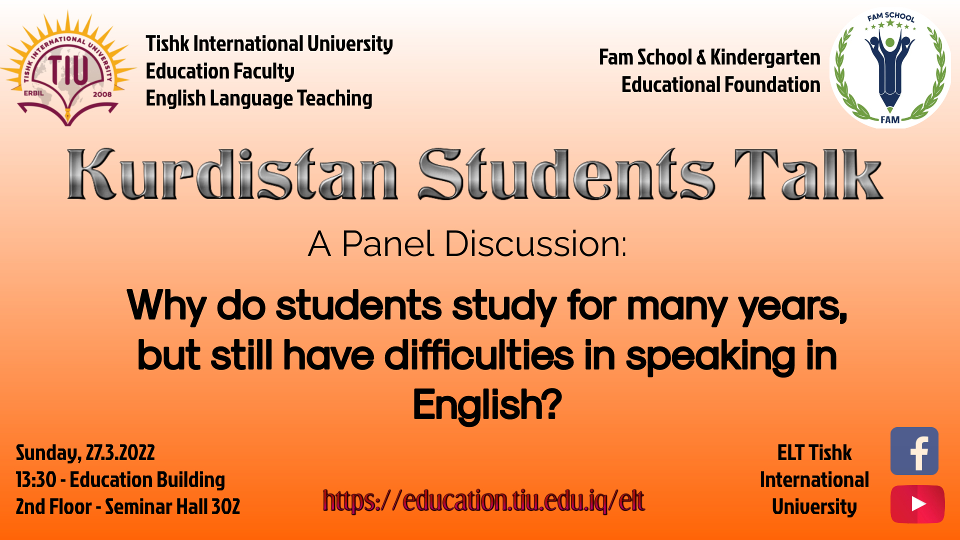 The 4th KST titled “Why do students study for many years, but still have difficulties speaking in English?”  will be held by the English Language Teaching Department (ELT), Faculty of Education Faculty at Tishk International University (TIU) on March 27th, 2022. A panel discussion will take place by students from Fam School – Ranya.