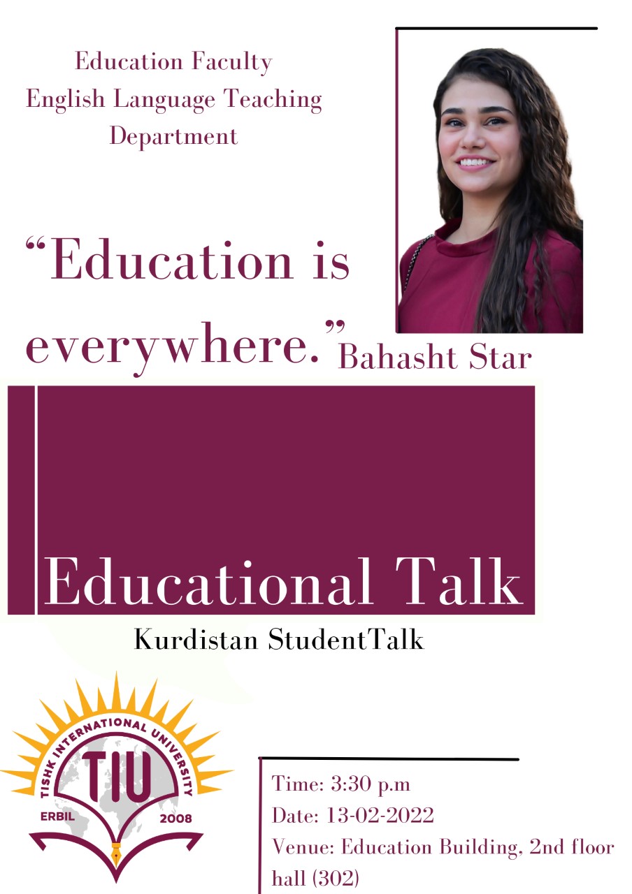 Education is a means of achieving a world of peace, justice, freedom, and equality for all. Thus, education is extremely necessary for all. No good life is possible without education. It indorses the intelligence of human beings, develops their skill, and enables them to be industrious. On Feb 13th, 2022 Sunday at 15:30, our senior student Bahasht Star will deliver a speech about Education and how it can be used as a powerful tool to reach the ultimate. The presentation will take place in Tishk International University, Education Faculty, Hall 302 Second Floor.