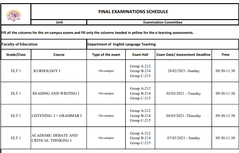 ELT 1 Final Exam Schedule Fall Semester 2020-2021