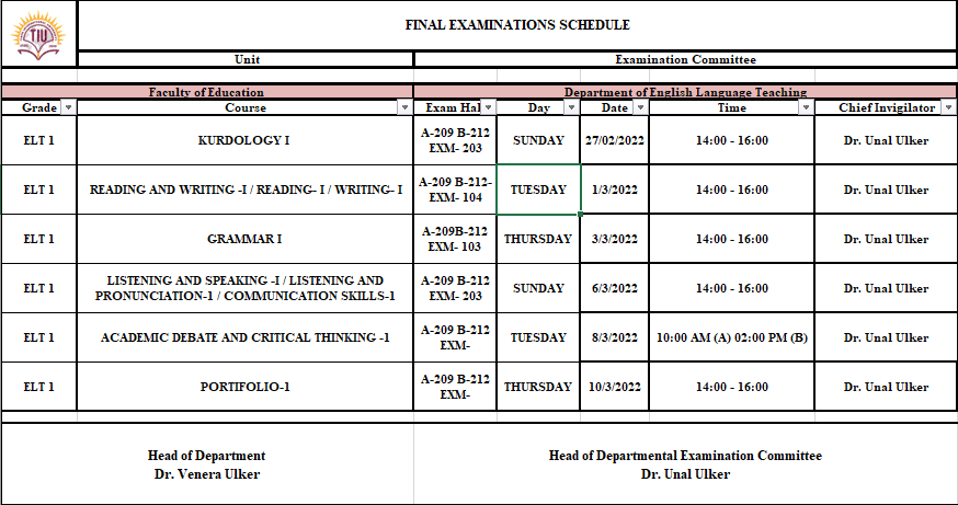 Dear ELT 1 Students, you can find the Final Exams Schedule down below.
