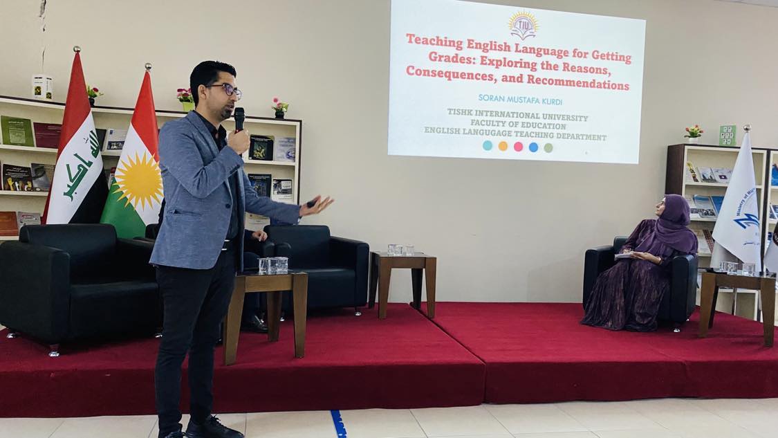 The symposium featured two panels, with one notable presentation by Mr. Soran Mustafa Kurdi from Tishk International University. Mr. Kurdi explored the reasons, consequences, and recommendations for teaching English for getting grades at public schools. His insightful analysis shed light on the challenges and potential solutions related to English language instruction at public schools.