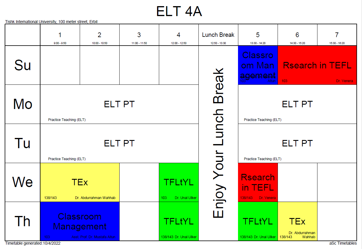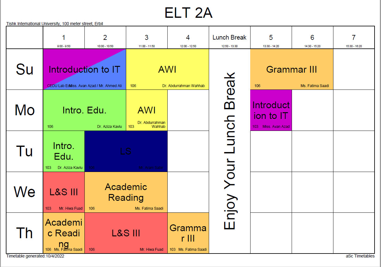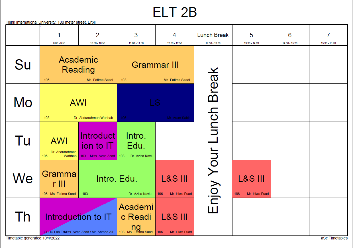 ELT Grades Tentative Schedule – New AY 2022-2023 Fall-Term Dear Students: Below are your tentative schedules for this week. ELT-2A.png ELT-2B.png ELT-3A.png ELT-3B.png ELT-4A.png ELT-4B.png Web Admin2022-10-04T18:29:50+03:00