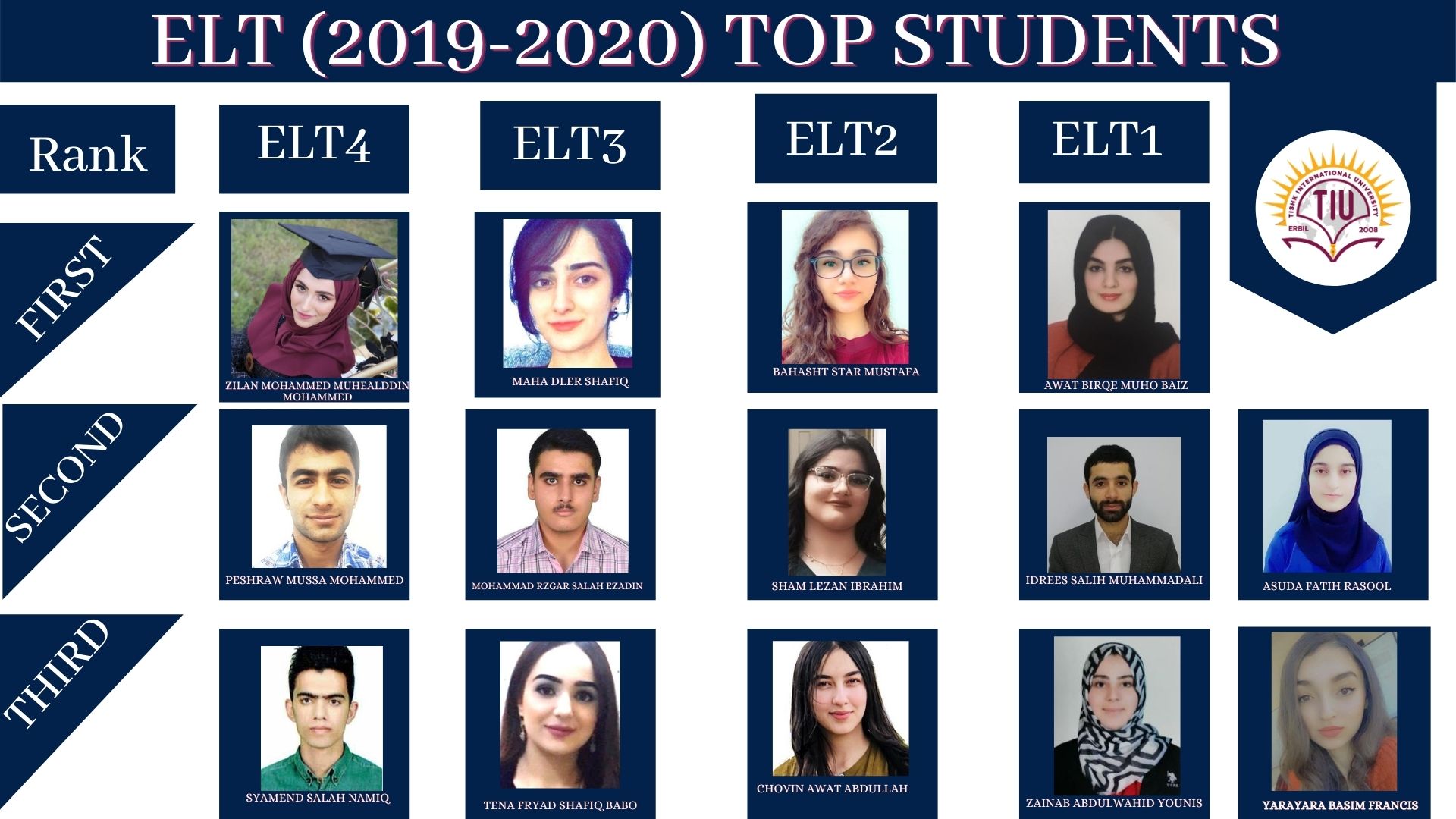 English Language Teaching Department is honored to announce the Department’s Top three Students of the academic year (2019-2020) . They showed great performance in their academic life . We at Tishk International University are deeply grateful for your generous achievements of our education.Please know that we acknowledge and appreciate your performance.