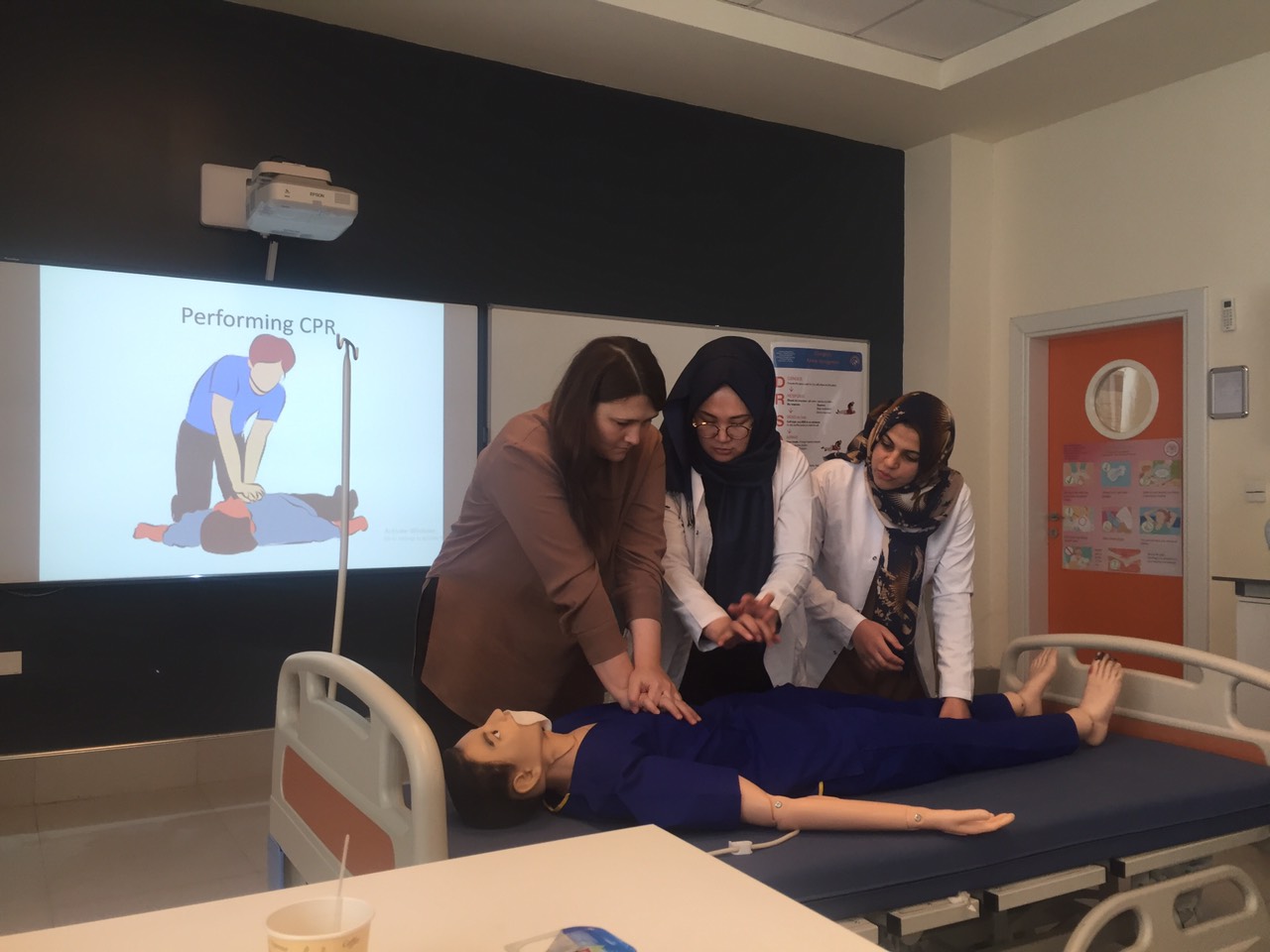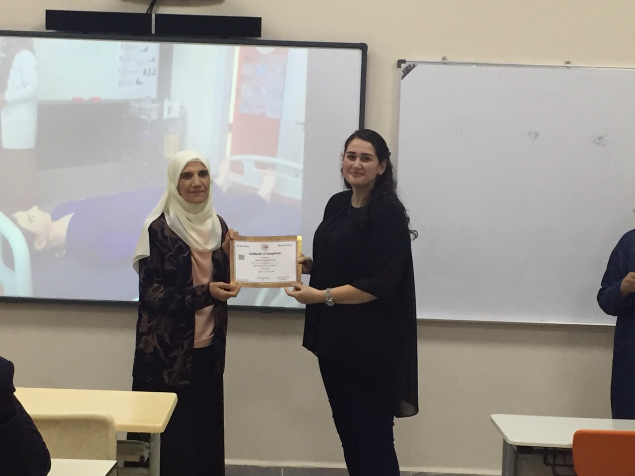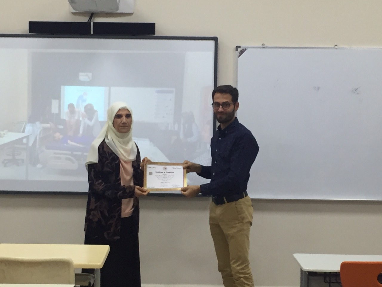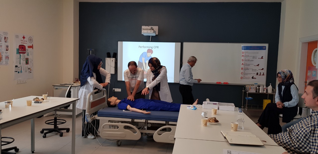 On September 29, 2019, the staff of the ELT department participated in a seminar on First Aid presented by the Nursing Faculty. The seminar included information about first aid kits, CPR, Heimlich maneuver, and more. The instructors encouraged the educators to demonstrate their newfound first aid skills. A certificate ceremony was held to present the participants with a certificate of completion in First Aid. The certificate was presented by instructors from the nursing faculty to the staff members of ELT.