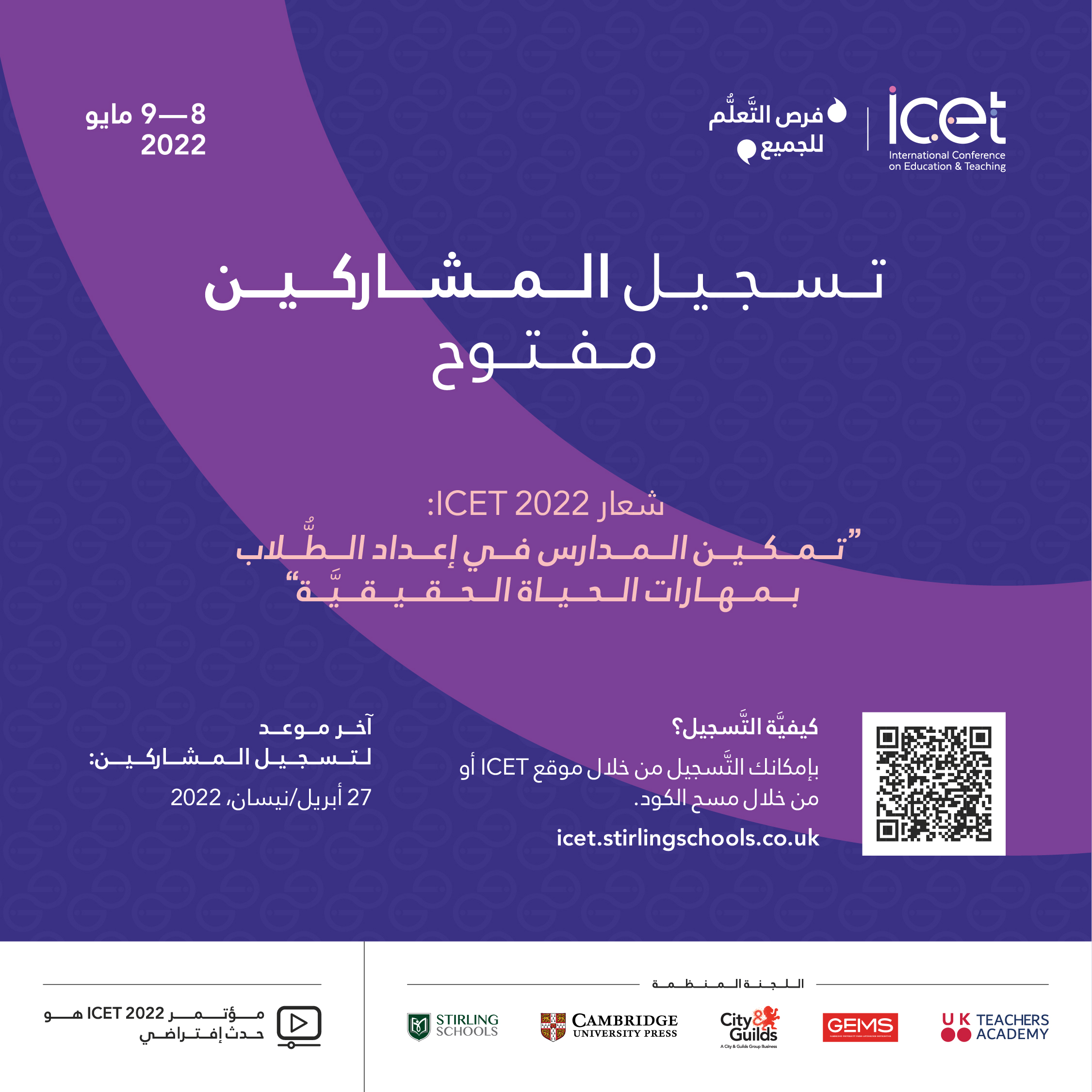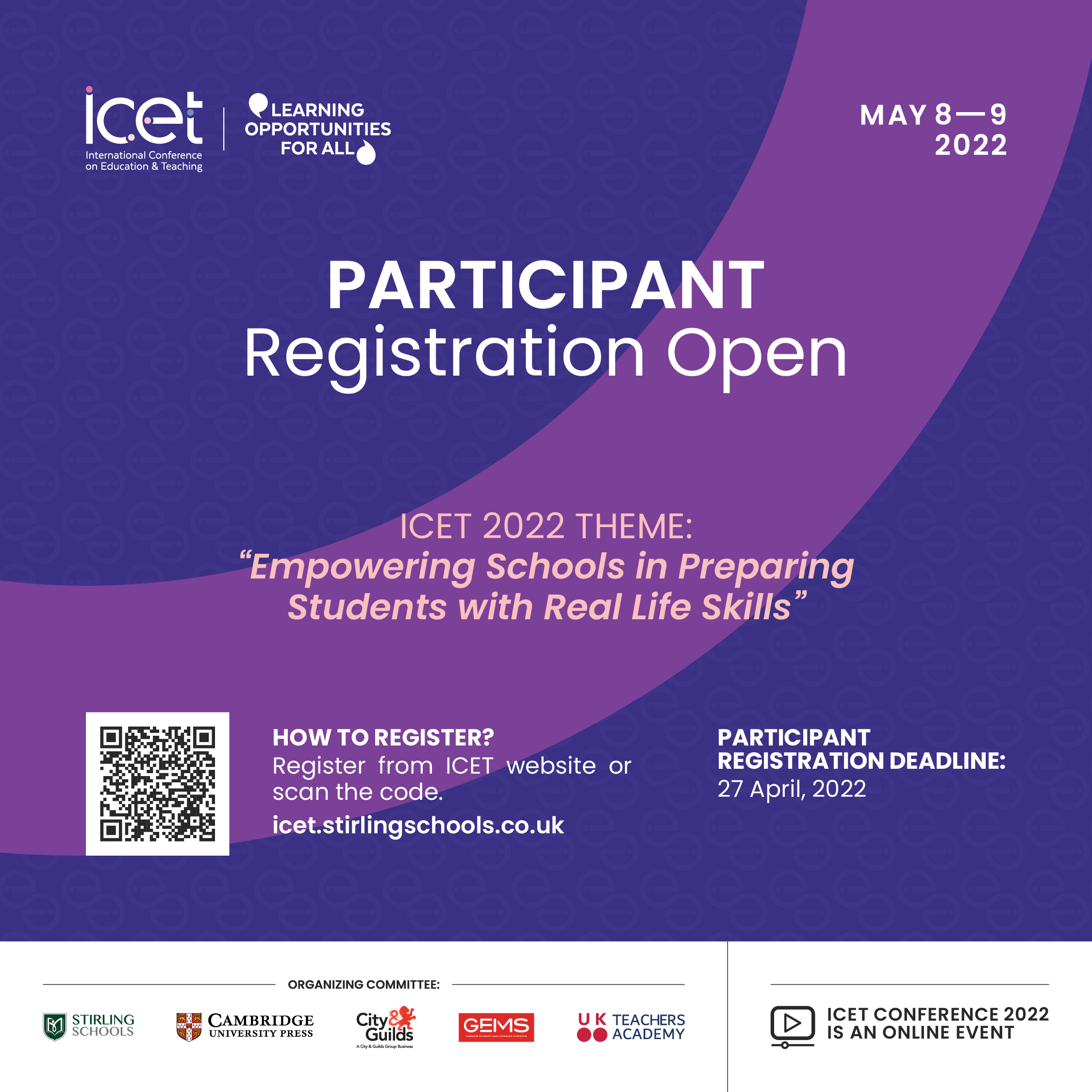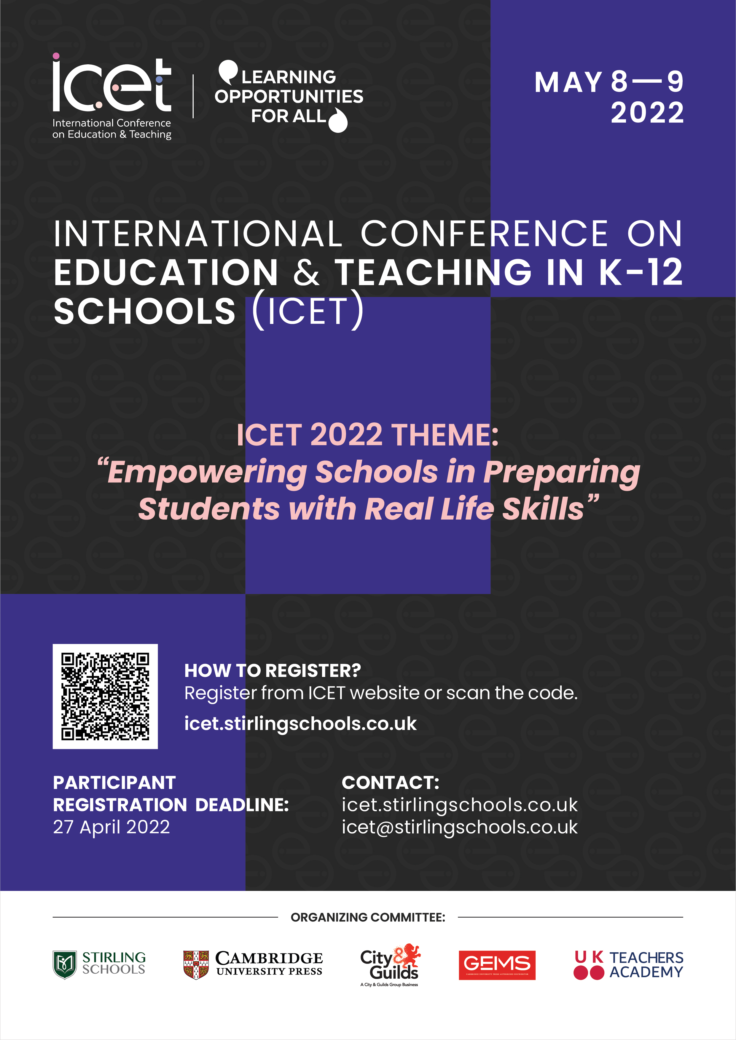 The International Conference on Education & Teaching in K-12 Schools (ICET) is a joint educational event organized by Stirling Schools, Cambridge University Press, City & Guilds, GEMS and UK Teachers Academy.