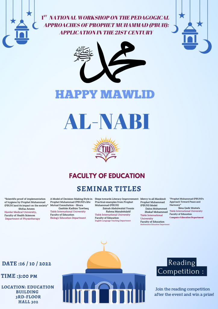 We are pleased to inform you that you are cordially invited to the “1st National Workshop on the Pedagogical Approaches of Prophet Muhammad (PBUH): Application in the 21st Century”. The Faculty of Education at Tishk International University is organising this event, and two students from the ELT Department, Zainab Abdulwahid Younis (ELT 4) and Rahma Manabdulatif (ELT 2), are going to present the “Steps towards Literacy Improvement: Practical examples from Prophet Muhammad (PBUH)”. The event will be held on October 16th, 2022, at 3:00 pm in Education Building, Hall 302. We look forward to your presence at the event.