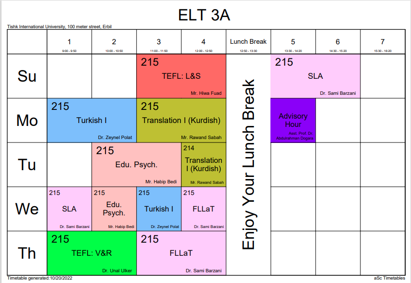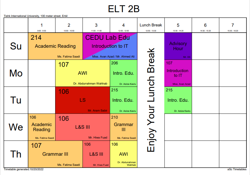 Updated ELT Grades Schedule AY 2022-2023 Fall-Term Dear Students: Your Schedule has been updated, and some of the classrooms have been changed. Web Admin2022-10-20T14:01:08+03:00
