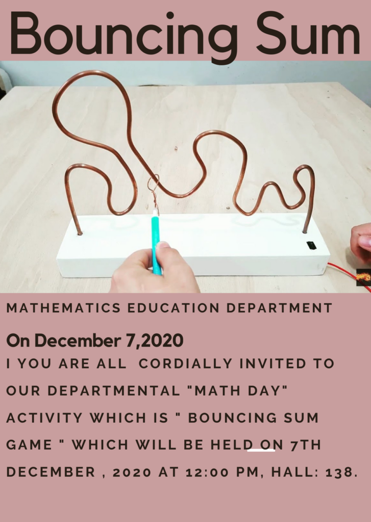 You are all invited to “Bouncing Sum Game” which is new departmental activity for academic year 2020-2021. Organized by head of mathematics education department and their assistant . which will be held on 7th December, 2020. At 12:00 PM.