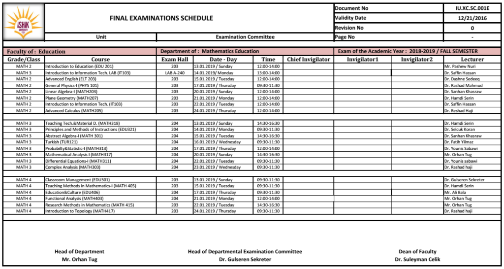 Math Department FINAL EXAM SCHEDULE FALL 2018-19