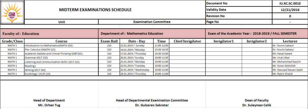 Math Department for Freshmen 2018-2019 Fall Term MidTerm Exams Schedule