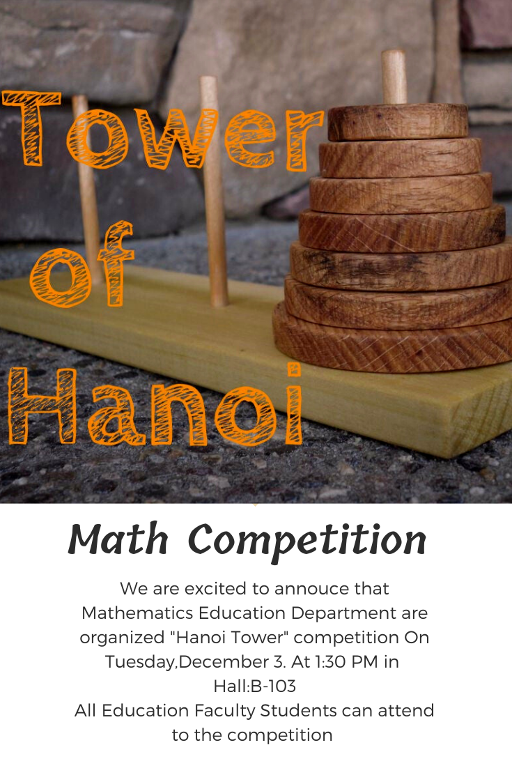 We are excited to annouce that Mathematics Education Department are organized “Hanoi Tower” competition. All Education Faculty Students can attent to the competition.