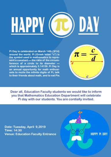 Dear all, students of Faculty of Education, we would like to inform you that Mathematics Education Department, with a little delay, is going to celebrate the day of the mathematical constant Pi, 3.141592… which is celebrated world