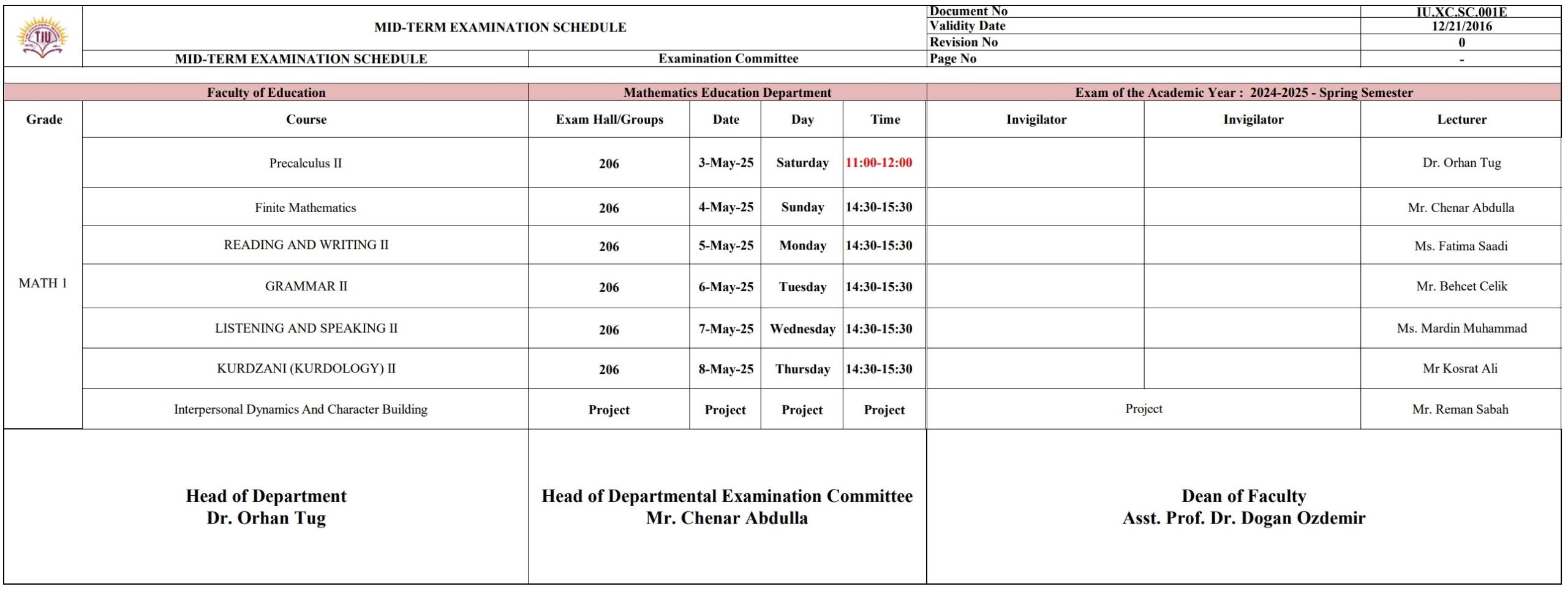 Midterm Schedule – First Grade (last updated: Jan 22, 2025 ).