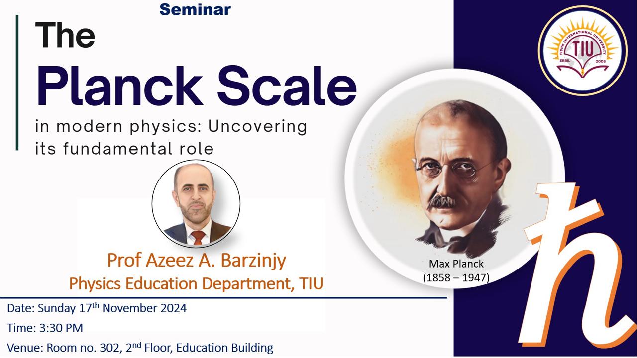 Tishk International University (TIU), Erbil — You are cordially invited to attend a seminar titled “The Planck Scale in modern physics: Uncovering its fundamental role,” organized by the Physics Education Department. This event is designed to offer valuable insights into one of the most intriguing concepts in modern physics. Event Details This seminar will be presented by Prof. Dr. Azeez A. Barzinjy and is an excellent opportunity for students and faculty to delve into the fascinating world of theoretical physics. Date: Sunday, November 17, 2024 Time: 15:30 Venue: Education Building, Hall 302, Tishk International University We look forward to welcoming [...]
