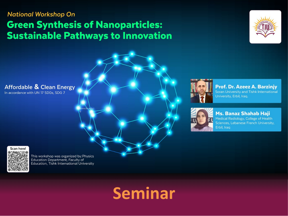 Tishk International University (TIU), Erbil — The Physics Education Department at the Faculty of Education is pleased to announce a national workshop titled "Green Synthesis of Nanoparticles: Sustainable Pathways to Innovation." This event is organized in alignment with the UN Sustainable Development Goals (SDGs), specifically focusing on SDG 7: Affordable and Clean Energy. Event Details This workshop will explore sustainable and innovative techniques for nanoparticle synthesis and their diverse applications, providing participants with valuable insights and opportunities for knowledge exchange. Date: Tuesday, December 24, 2024 Time: 9:00 AM - 11:00 AM Venue: Education Building, Room 302, Tishk International University Keynote [...]