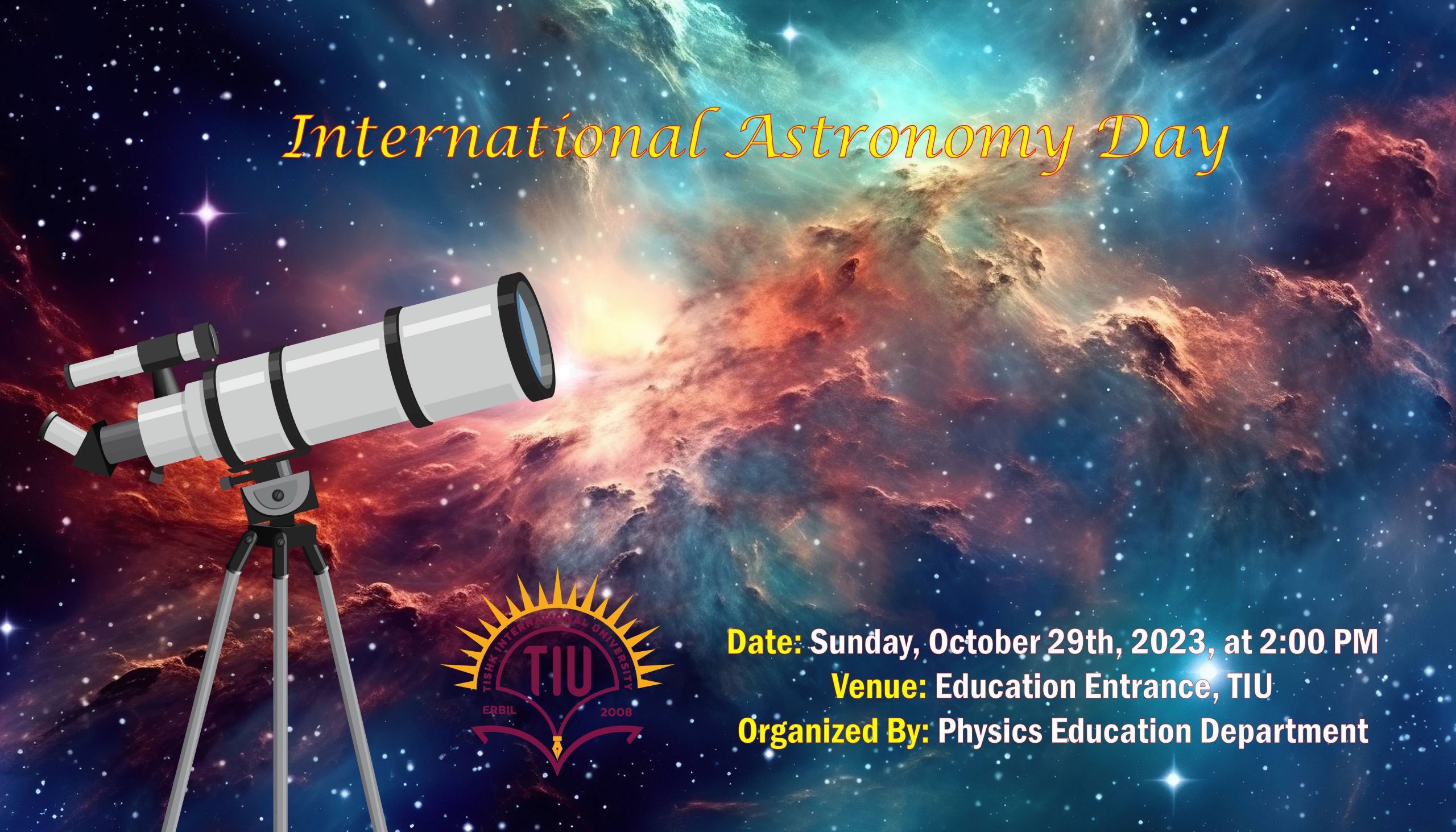 The Astronomy Club at the Department of Physics Education, Faculty of Education at Tishk International University, announces an exhibition on Sunday, October 29th, 2023, at 2:00 PM to celebrate International Astronomy Day, a worldwide event. The aim of the event is to familiarise students with the astronomical aspects and set up astronomical telescopes in front of the Faculty of Education to observe the sun’s surface. The astronomy club will hold activities such as sunspots, solar flares, and solar prominence. The department has also invited Mr. Azhy Chato Hasan to share his experiences with us. He is a well-known expert on astronomical observation of sun activities and is the Director of the Kurdistan Astronomical Organization in the Kurdistan Region of Iraq and the astronomical observatory for solar radiation at the College of Science at Salahaddin University. Our exhibition includes various activities, as stated below:
