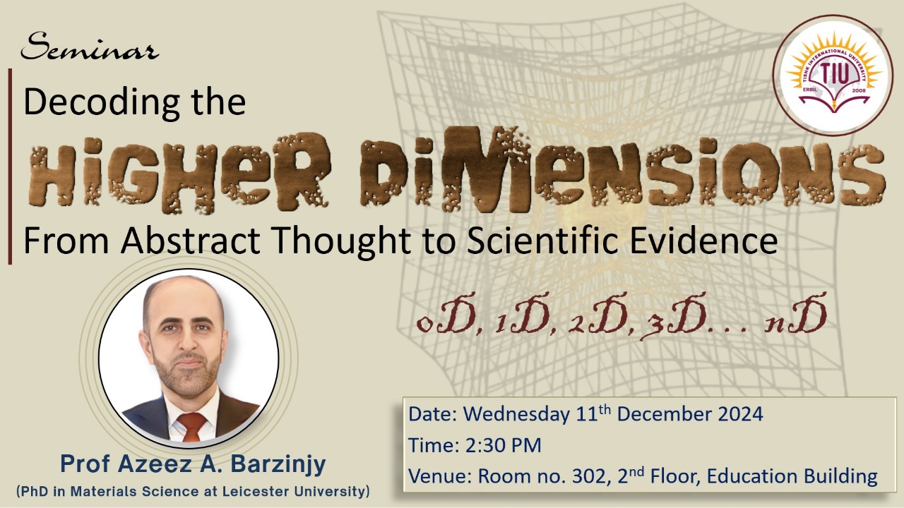 Tishk International University (TIU), Erbil — The Physics Education Department is pleased to announce a seminar titled “Decoding the Higher Dimensions: From Abstract Thought to Scientific Evidence.” This compelling presentation will be led by Prof. Dr. Azeez A. Barzinjy and is open to all students, staff, and faculty.