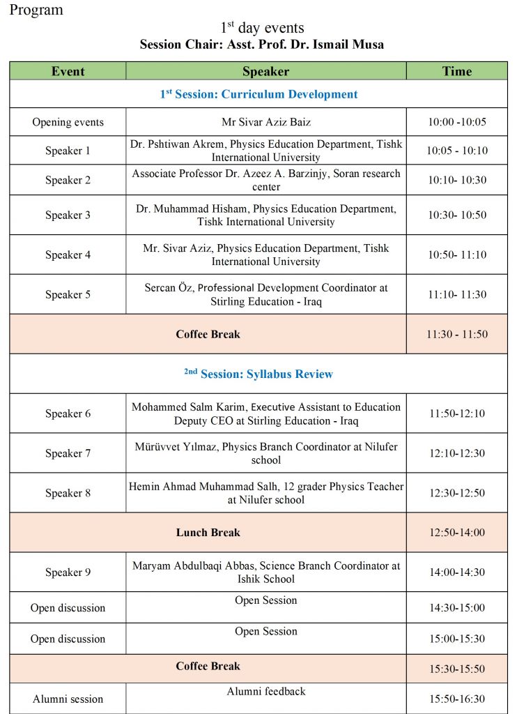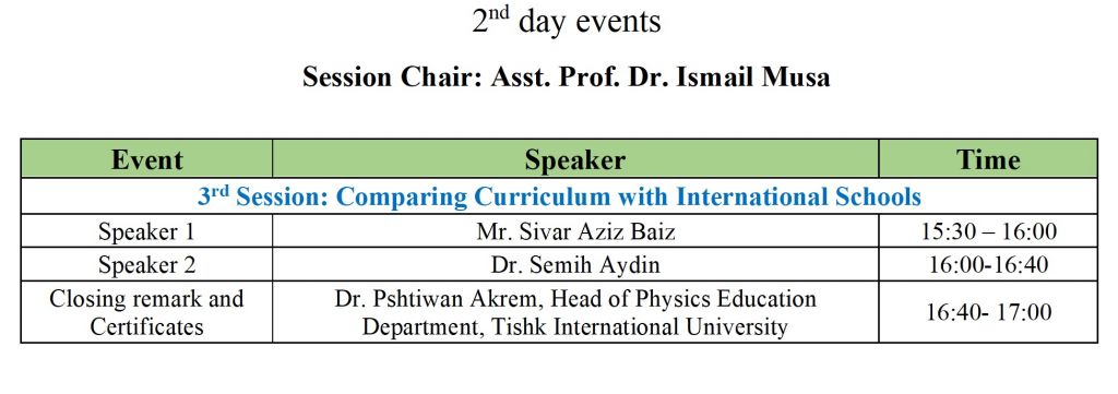 The Physics Education Department, Faculty of Education at Tishk International University is to hold an International Workshop on Curriculum Development on September 4th, and 17th, 2023, designed to be a forum for expert academic staff to review and evaluate the curriculum and syllabuses of the department as an important factor in the faculty development process. The workshop sessions will be carried out by academic staff from the Physics Department, physics and science coordinators from international and private schools. The workshop will provide a platform to review, discuss, and recommend important points in the improvement of the curriculum in the Physics Education Department in accordance with schools and international academic and educational standards.