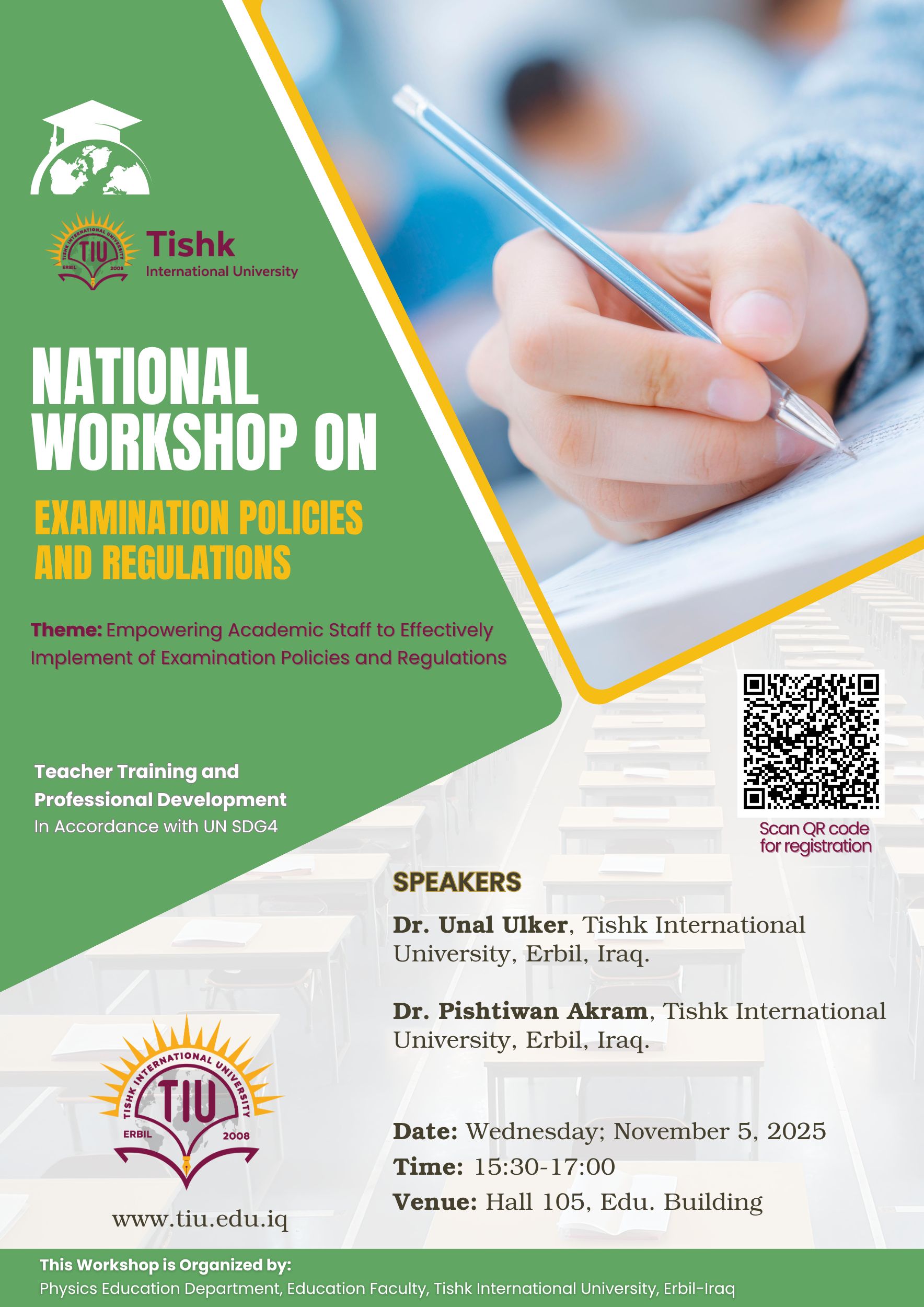 The Physics Education Department, Faculty of Education at Tishk International University (TIU), Erbil–Iraq, is proud to announce the upcoming National Workshop titled “Examination Policies and Regulations: Empowering Academic Staff for Effective Implementation of Examination Policies and Regulations.”